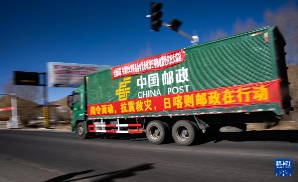 1月8日,在日喀則市境內(nèi)的318國道旁,中國郵政的抗震救災物資運輸車輛向震中方向駛?cè)ァ?/p>