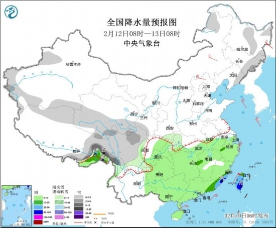 全國降水量預報圖(2月11日08時-12日08時) 圖片來源:中央氣象臺網站