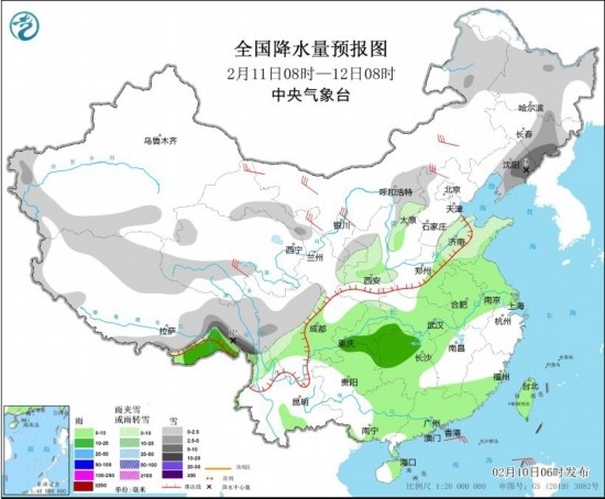全國降水量預報圖(2月10日08時-11日08時) 圖片來源:中央氣象臺網站