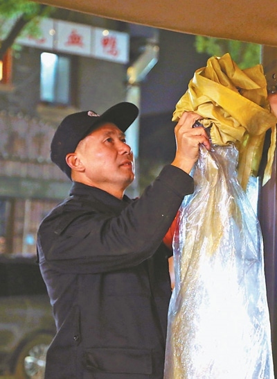 一場(chǎng)小雨后,執(zhí)法隊(duì)員幫助沿街店鋪撤收擋雨棚。