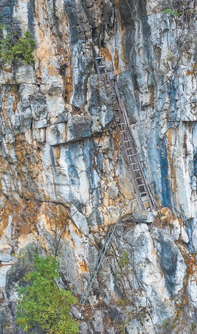 第三條路被村民們稱作“天路”。這是一段垂直高度200米的懸崖峭壁,大約1小時就能抵達山頂,但全程需要沿峭壁攀爬?!芭赖臅r候根本不敢往下看,只有初中的大孩子偶爾會在家長帶領下走這條路?!卞X慶輝說。