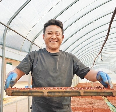 農戶將育秧盤送入暗室催芽。