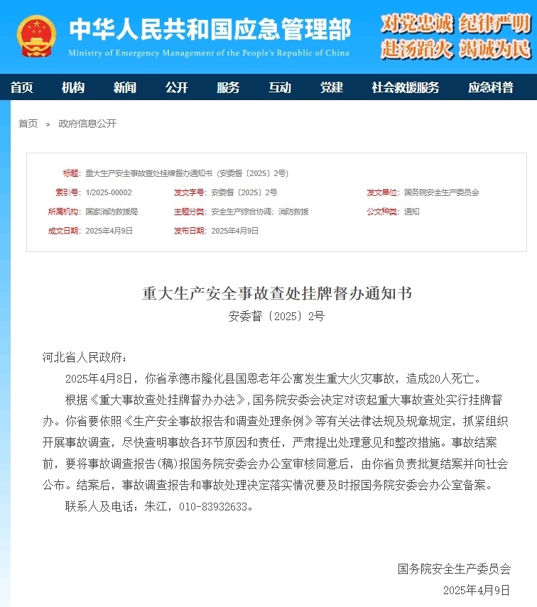 人民網(wǎng)北京4月9日電 (記者溫璐、郝萍)據(jù)應(yīng)急管理部消息,4月9日,國務(wù)院安全生產(chǎn)委員會(huì)發(fā)布向河北省人民政府發(fā)布重大生產(chǎn)安全事故查處掛牌督辦通知書。通知書稱,2025年4月8日,河北省承德市隆化縣國恩老年公寓發(fā)生重大火災(zāi)事故,造成20人死亡。根據(jù)《重大事故查處掛牌督辦辦法》,國務(wù)院安委會(huì)決定對(duì)該起重大事故查處實(shí)行掛牌督辦。河北省要依照《生產(chǎn)安全事故報(bào)告和調(diào)查處理?xiàng)l例》等有關(guān)法律法規(guī)及規(guī)章規(guī)定,抓緊組織開展事故調(diào)查,盡快查明事故各環(huán)節(jié)原因和責(zé)任,嚴(yán)肅提出處理意見和整改措施。事故結(jié)案前,要將事故調(diào)查報(bào)告(稿)報(bào)國務(wù)院安委會(huì)辦公室審核同意后,由河北省負(fù)責(zé)批復(fù)結(jié)案并向社會(huì)公布。結(jié)案后,事故調(diào)查報(bào)告和事故處理決定落實(shí)情況要及時(shí)報(bào)國務(wù)院安委會(huì)辦公室備案。