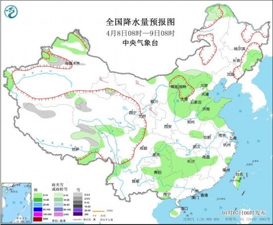 4月8日08時至9日08時,新疆北部、內(nèi)蒙古中東部、西藏北部、青海南部等地有小到中雪或雨夾雪,內(nèi)蒙古中部、陜西北部、山西、河北北部和南部、山東、貴州東部和南部、湖南中南部、江西中部、廣西中北部、海南島、臺灣島等地有小到中雨。內(nèi)蒙古大部、甘肅河西、陜西中北部、山西等地部分地區(qū)有4~6級風(fēng),陣風(fēng)7級。