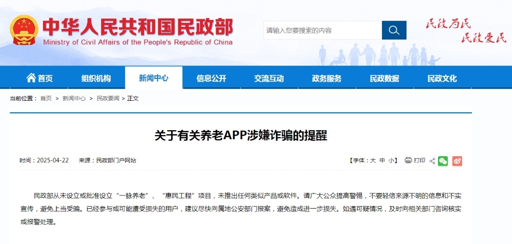 4月22日,民政部發(fā)布公告表示,民政部從未設(shè)立或批準(zhǔn)設(shè)立“一脈養(yǎng)老”“惠民工程”項(xiàng)目,未推出任何類似產(chǎn)品或軟件。請廣大公眾提高警惕,不要輕信來源不明的信息和不實(shí)宣傳,避免上當(dāng)受騙。已經(jīng)參與或可能遭受損失的用戶,建議盡快向?qū)俚毓膊块T報案,避免造成進(jìn)一步損失。如遇可疑情況,及時向相關(guān)部門咨詢核實(shí)或報警處理。(記者朱高祥)