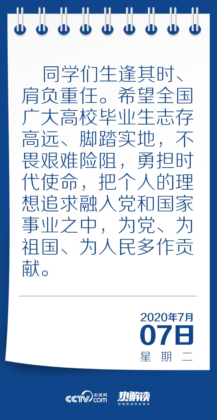 習(xí)近平總書記在回信中高度肯定了同學(xué)們到邊疆基層工作的選擇,并對廣大高校畢業(yè)生提出殷切期望:“希望全國廣大高校畢業(yè)生志存高遠、腳踏實地,不畏艱難險阻,勇?lián)鷷r代使命,把個人的理想追求融入黨和國家事業(yè)之中,為黨、為祖國、為人民多作貢獻。”