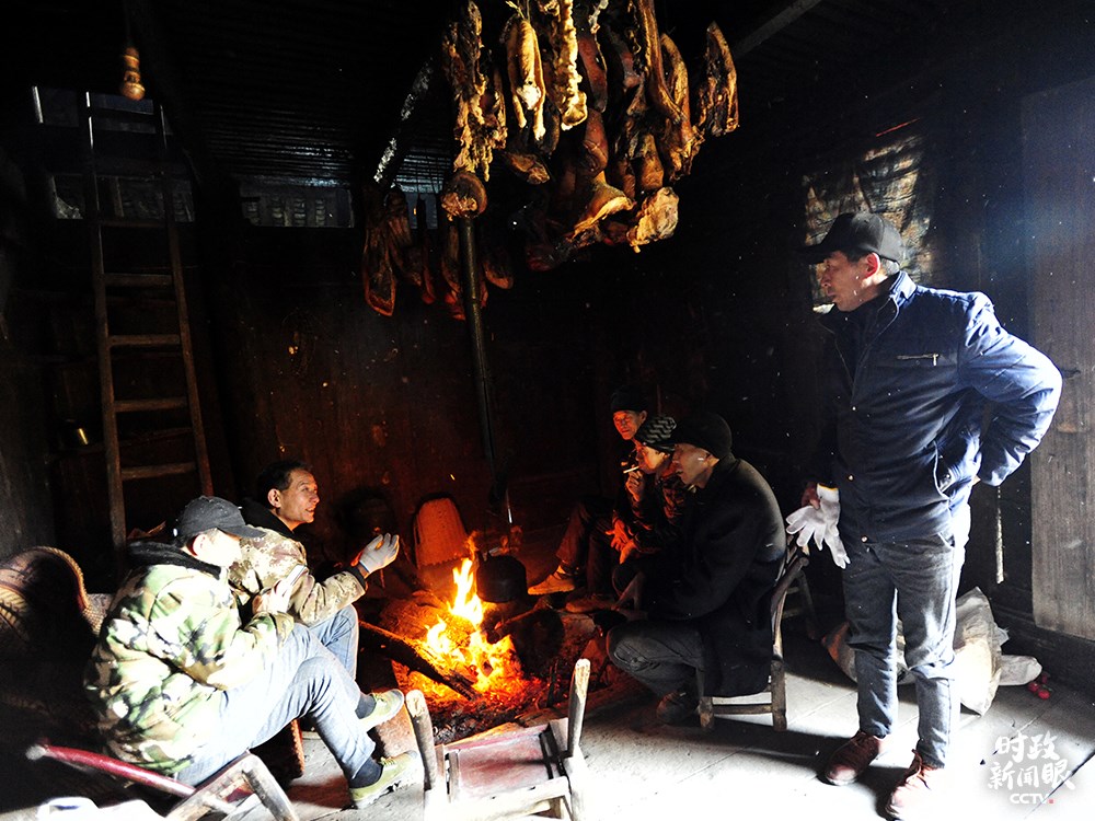 △漁山村村民在自家屋里熏制臘肉,圍爐交談。