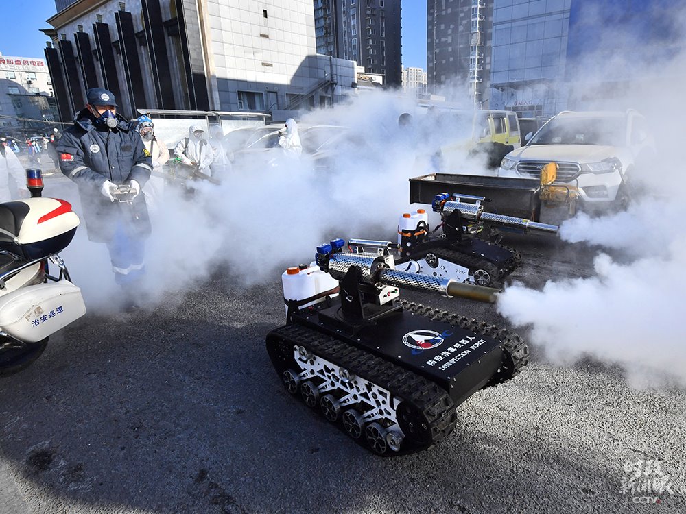 △1月9日,北京岳各莊市場,2臺(tái)“坦克”防疫消殺機(jī)器人對(duì)市場進(jìn)行消殺。這種消殺“新裝備”裝有大容量藥壺,每小時(shí)消殺約10000平方米。