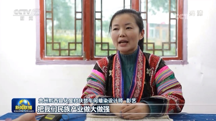 貴州黔西縣化屋村扶貧車間蠟染設(shè)計(jì)師彭藝:把我們民族產(chǎn)業(yè)做大做強(qiáng),讓我們苗族同胞的生活,過(guò)得像我們蠟染刺繡一樣精彩。