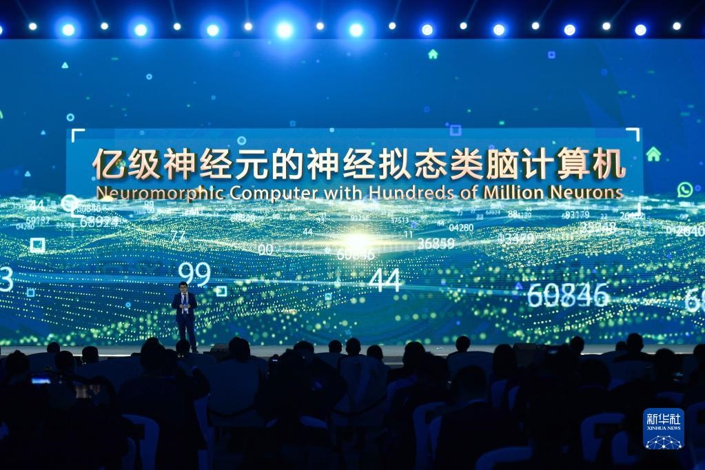 浙江大學、之江實驗室代表在“世界互聯(lián)網(wǎng)領(lǐng)先科技成果發(fā)布”活動上介紹“億級神經(jīng)元的神經(jīng)擬態(tài)類腦計算機”(2020年11月23日攝)。新華社記者 黃宗治 攝