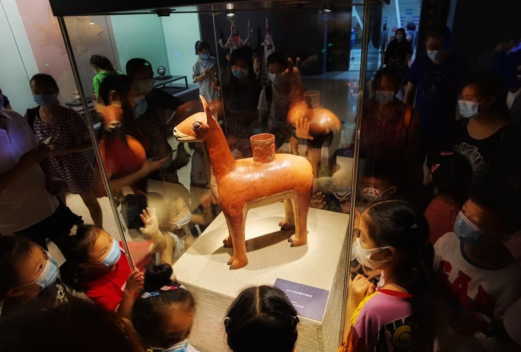 2020年7月4日,游客正在重慶中國(guó)三峽博物館觀看“失落的黃金國(guó)——安第斯文明特展”。該展以安第斯文明為主線,展出來自秘魯11家博物館的近200件套陶器、金器、紡織品等文物。