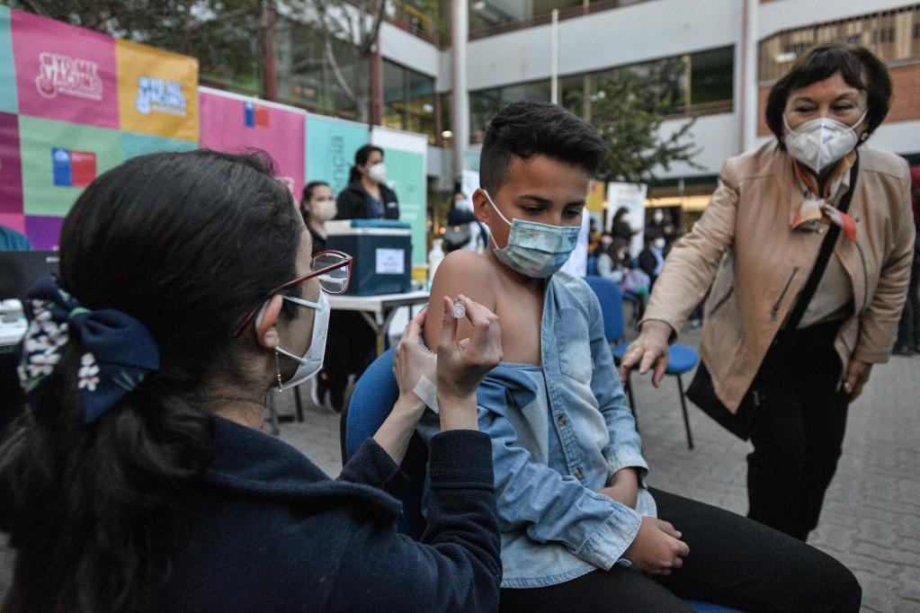 2021年9月27日,一名兒童在智利首都圣地亞哥接種科興新冠疫苗。27日起,智利開始對(duì)6歲至11歲在校學(xué)生接種中國(guó)科興疫苗。