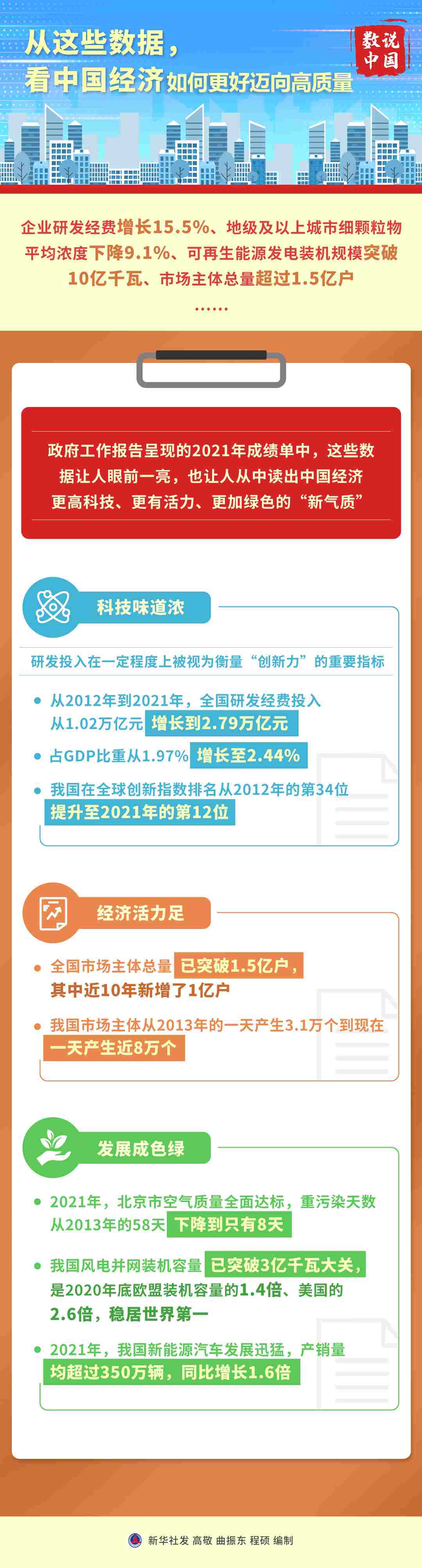 企業(yè)研發(fā)經(jīng)費增長15.5%、市場主體總量超過1.5億戶、可再生能源發(fā)電裝機規(guī)模突破10億千瓦……政府工作報告呈現(xiàn)的2021年成績單中,這些數(shù)據(jù)讓人眼前一亮。同時,報告的一系列新部署,也讓人從中讀出中國經(jīng)濟更重創(chuàng)新、更加綠色,更堅定邁向高質(zhì)量發(fā)展。