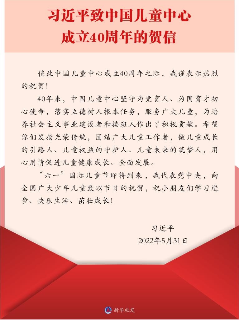 習(xí)近平致中國兒童中心成立40周年的賀信
