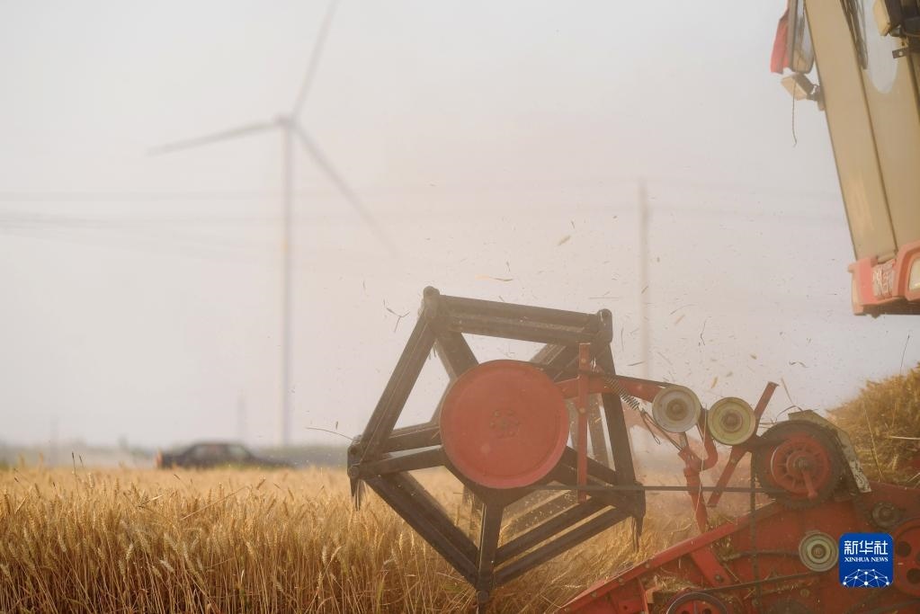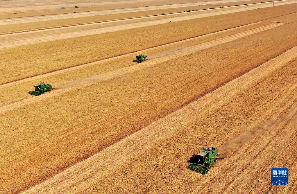 在河南省安陽市湯陰縣菜園鎮(zhèn)高標準農(nóng)田示范區(qū),收割機在麥田作業(yè)(2022年6月8日攝)。新華社記者 郝源 攝