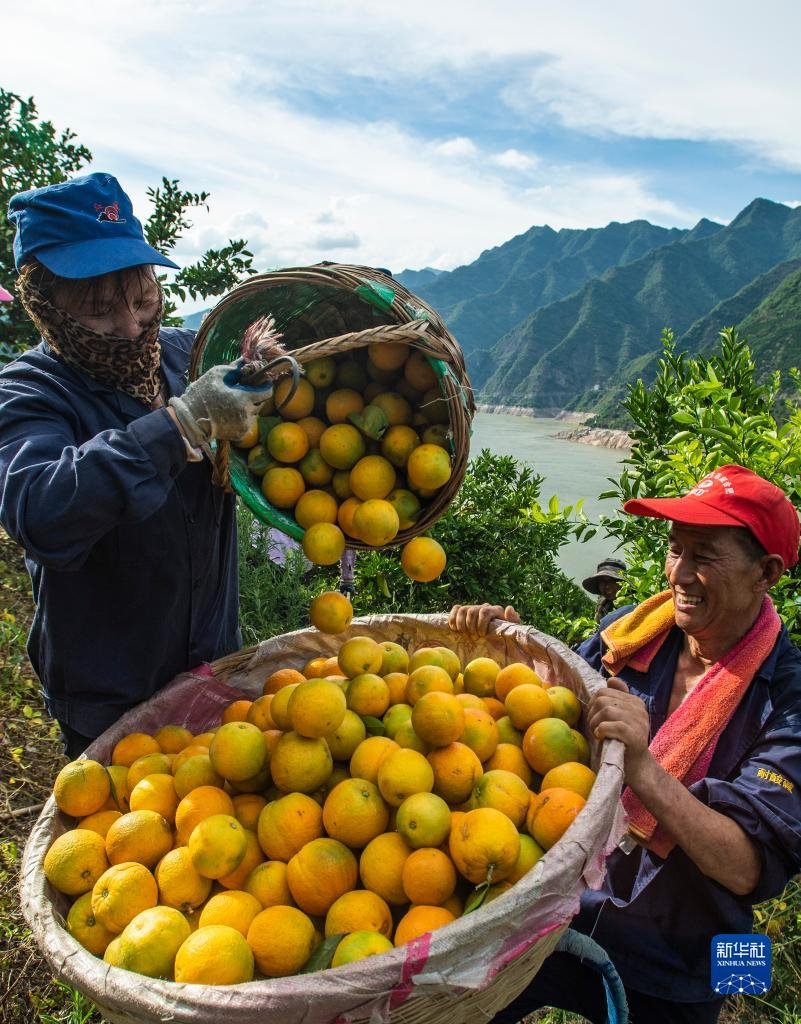 湖北省宜昌市秭歸縣沙鎮(zhèn)溪鎮(zhèn)臺子灣村村民在柑橘園里轉(zhuǎn)運夏橙(2022年6月21日攝)。新華社發(fā)(鄭家裕 攝)