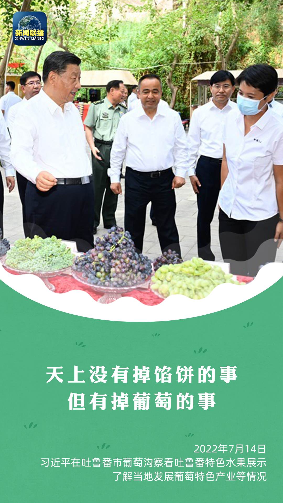 今年7月14日,習近平來到吐魯番市考察調研。在葡萄溝,習近平察看吐魯番特色水果展示。當?shù)仄咸哑贩N紛繁,琳瑯滿目。