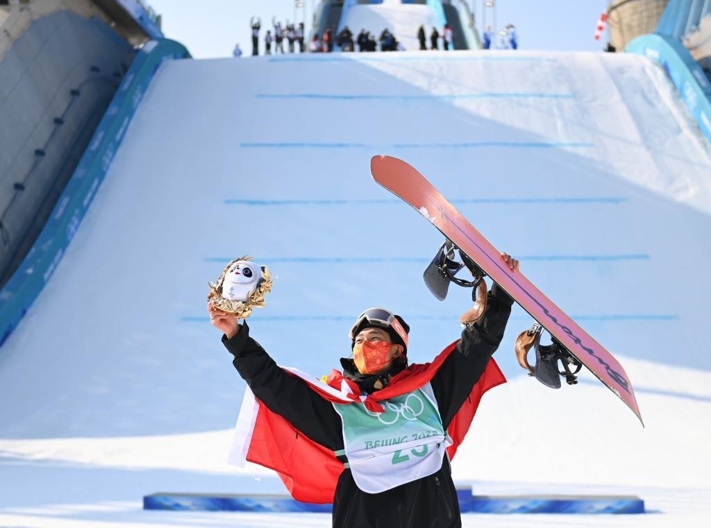 這是2022年2月15日,中國選手蘇翊鳴在北京2022年冬奧會單板滑雪男子大跳臺決賽奪冠后慶祝。新華社記者 黃宗治 攝
