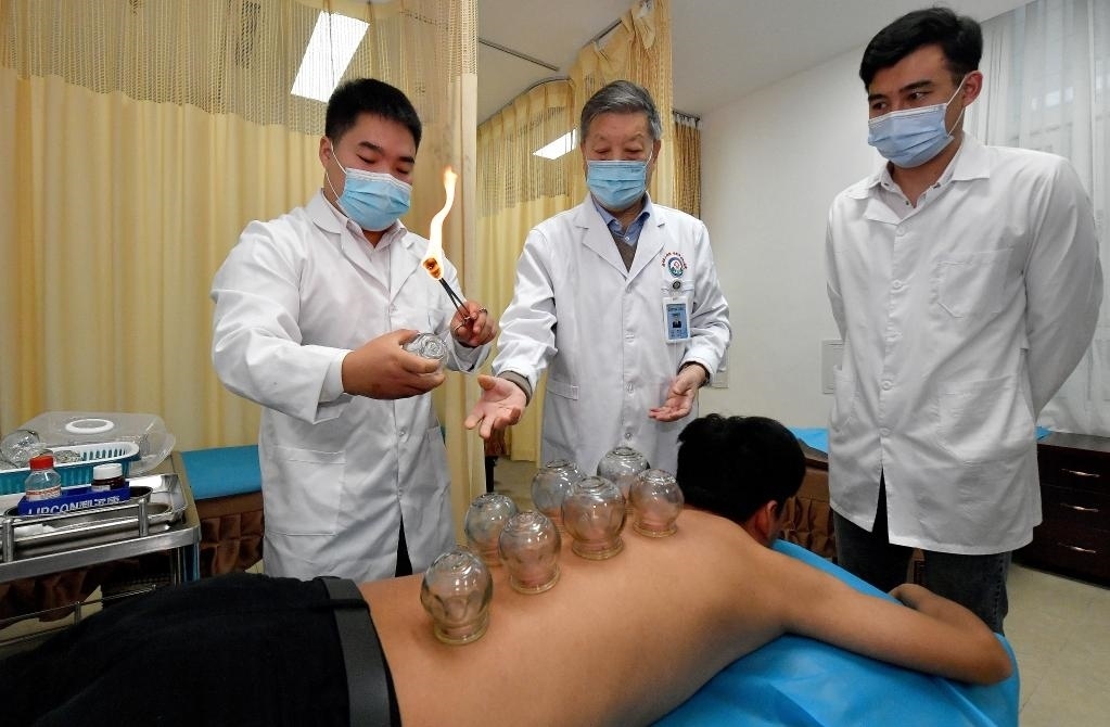 2020年11月10日,陜西中醫(yī)藥大學(xué)針灸推拿學(xué)院教授賈成文(中)在指導(dǎo)馬文軒(右)進行拔罐。新華社記者 劉瀟 攝