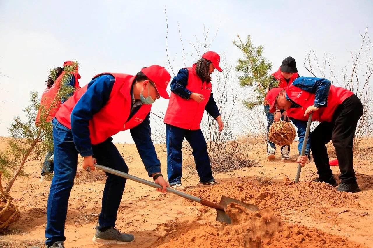 △2023年4月12日,志愿者在寧夏靈武白芨灘國家級(jí)自然保護(hù)區(qū)開展義務(wù)植樹、扎草方格。