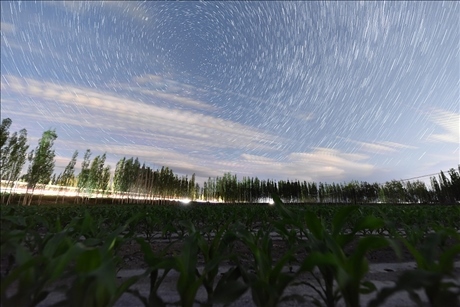 △新疆巴州和靜縣哈爾莫敦鎮(zhèn)查茨村高標(biāo)準(zhǔn)農(nóng)田防護(hù)林的夏日星空夜景