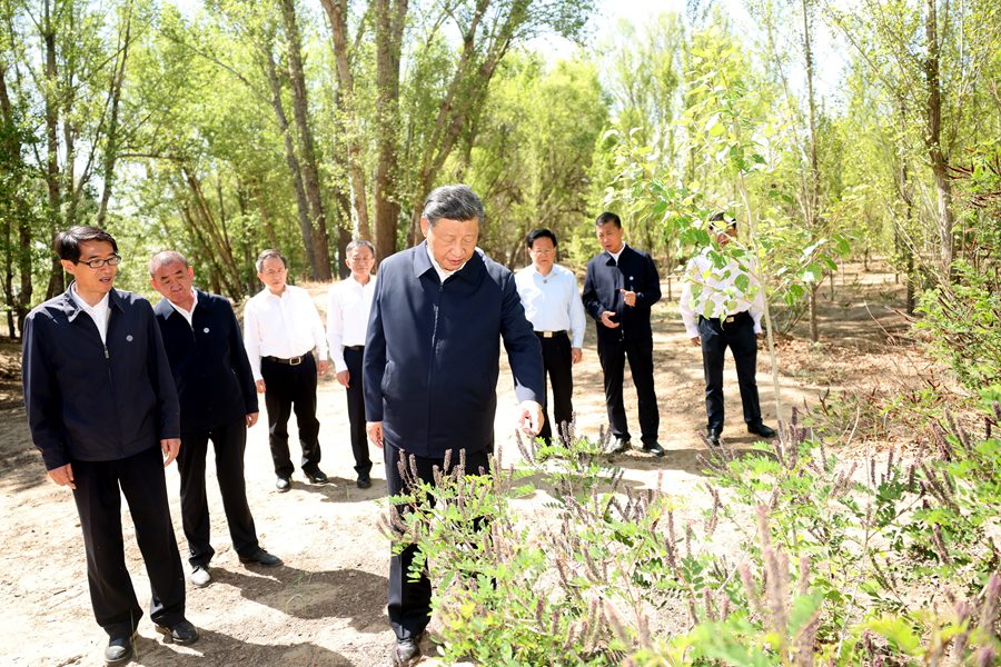 2023年6月5日至6日,中共中央總書記、國家主席、中央軍委主席習近平在內蒙古巴彥淖爾考察,并主持召開加強荒漠化綜合防治和推進“三北”等重點生態(tài)工程建設座談會。這是5日下午,習近平在烏梁素??疾?。新華社記者