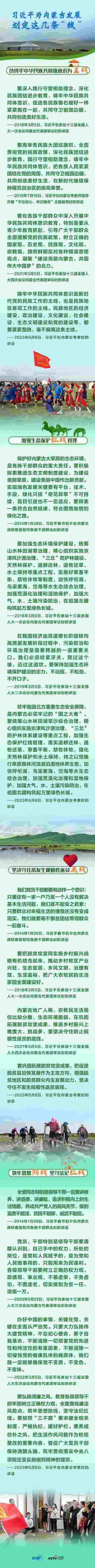 6月8日,習(xí)近平總書記聽取內(nèi)蒙古自治區(qū)黨委和政府工作匯報后發(fā)表講話,強(qiáng)調(diào)內(nèi)蒙古要“以鑄牢中華民族共同體意識為主線”,“加強(qiáng)生態(tài)保護(hù)紅線管理”,“堅(jiān)決守住不發(fā)生規(guī)模性返貧底線”,“筑牢思想防線,堅(jiān)守法紀(jì)紅線”。