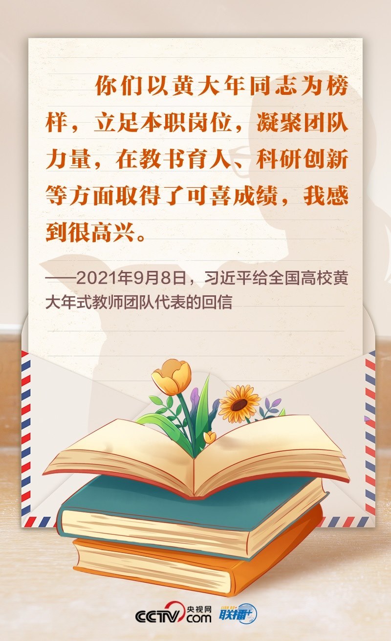 2021年,首批黃大年式教師團(tuán)隊(duì)的代表給總書記寫信,匯報(bào)教學(xué)、科研等工作情況,表達(dá)了堅(jiān)守教育報(bào)國理想、為民族復(fù)興貢獻(xiàn)力量的決心。總書記回信肯定了大家的工作成效,勉勵(lì)大家繼續(xù)學(xué)習(xí)弘揚(yáng)黃大年同志等優(yōu)秀教師的高尚精神,立德修身,潛心治學(xué),開拓創(chuàng)新,真正把為學(xué)、為事、為人統(tǒng)一起來,當(dāng)好學(xué)生成長的引路人。