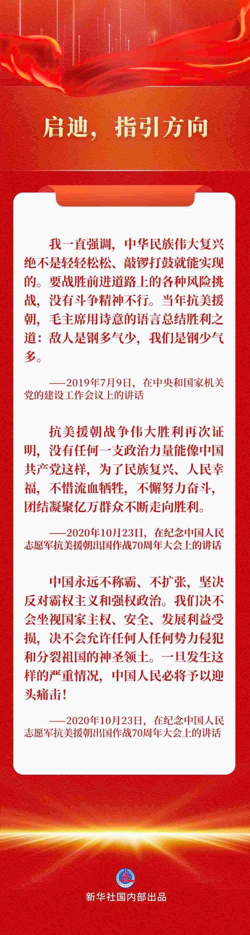 習(xí)近平總書記曾多次談起這段氣壯山河的英雄史詩,深情講述這些“最可愛的人”的動人故事,以史為鑒,為全黨全軍全國各族人民指明前行方向。