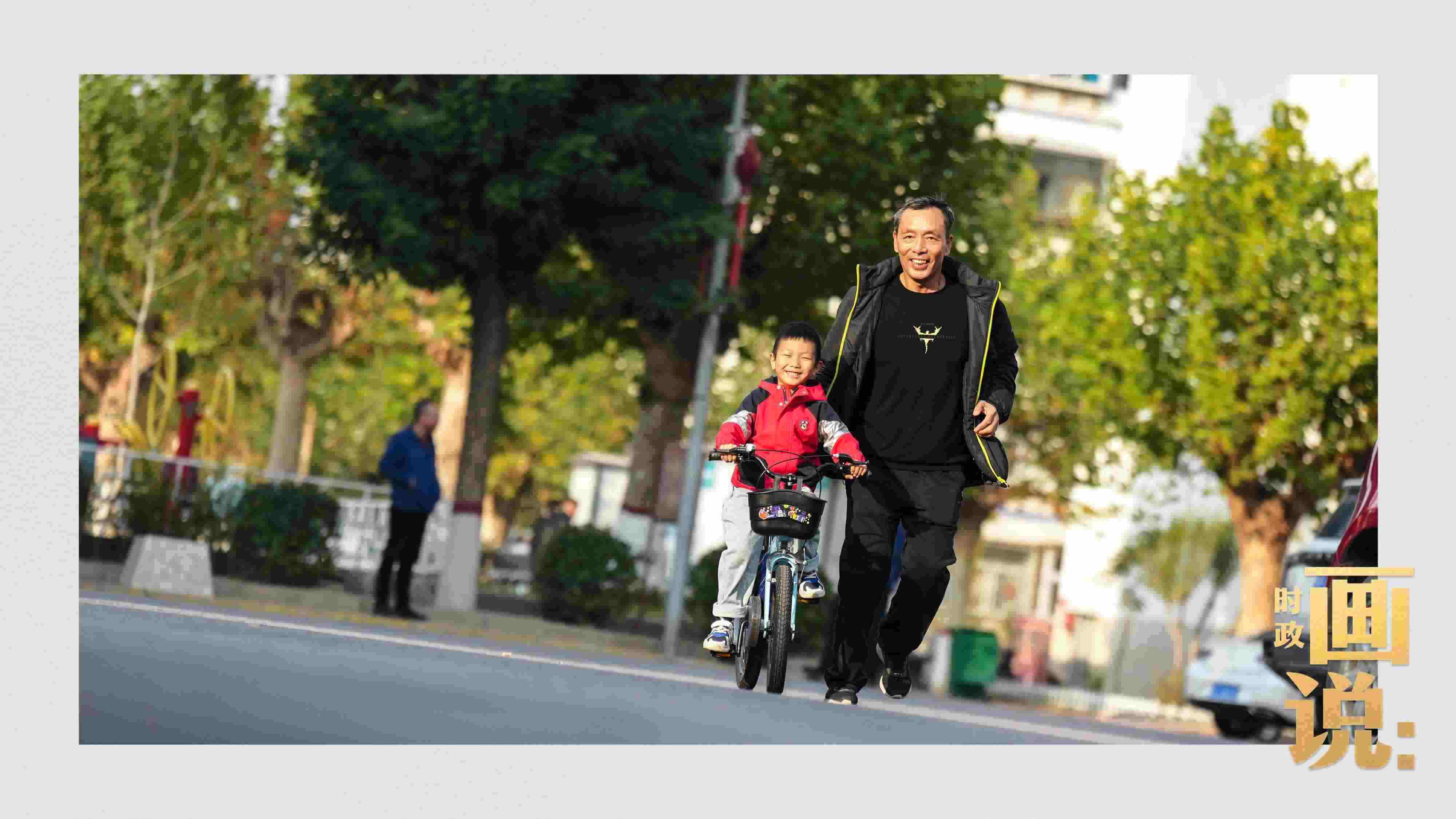 △學(xué)騎自行車的爺孫倆其樂融融。冬日的暖陽(yáng)留在身上,會(huì)心的笑容掛在臉上。永濟(jì)秀園小區(qū),涿州。