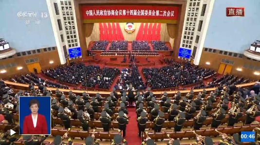 3月4日下午3時,全國政協(xié)十四屆二次會議在人民大會堂開幕,全體起立,高唱中華人民共和國國歌。