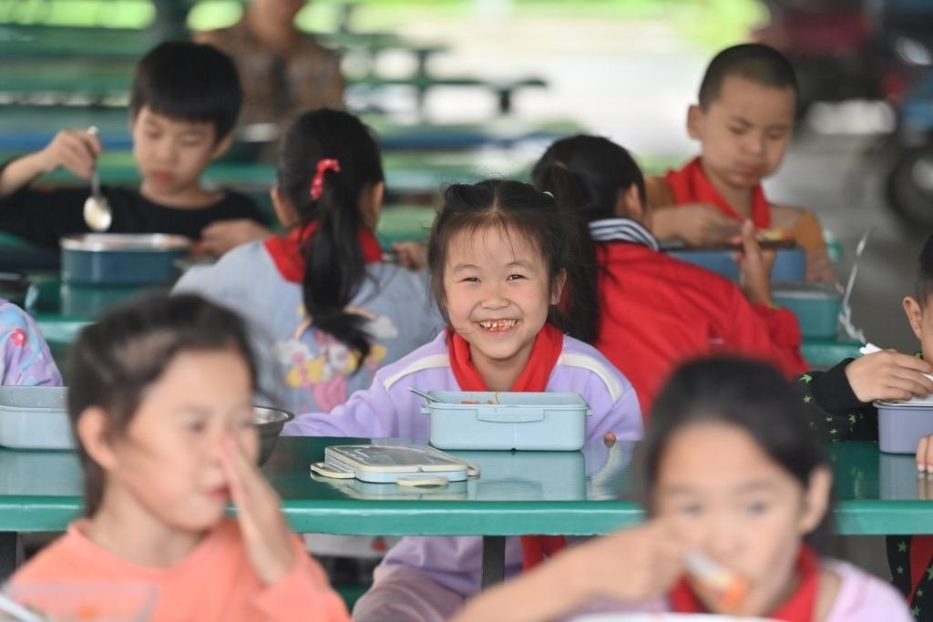 5月31日,廣西柳州市柳江區(qū)三都鎮(zhèn)覺山教學(xué)點,學(xué)生們在吃營養(yǎng)午餐。