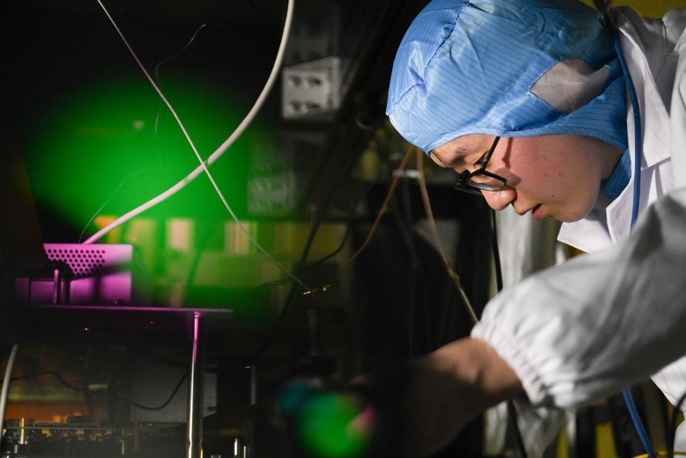 2022年1月31日,中國(guó)科學(xué)技術(shù)大學(xué)學(xué)生在中國(guó)科學(xué)院量子信息重點(diǎn)實(shí)驗(yàn)室做實(shí)驗(yàn)。