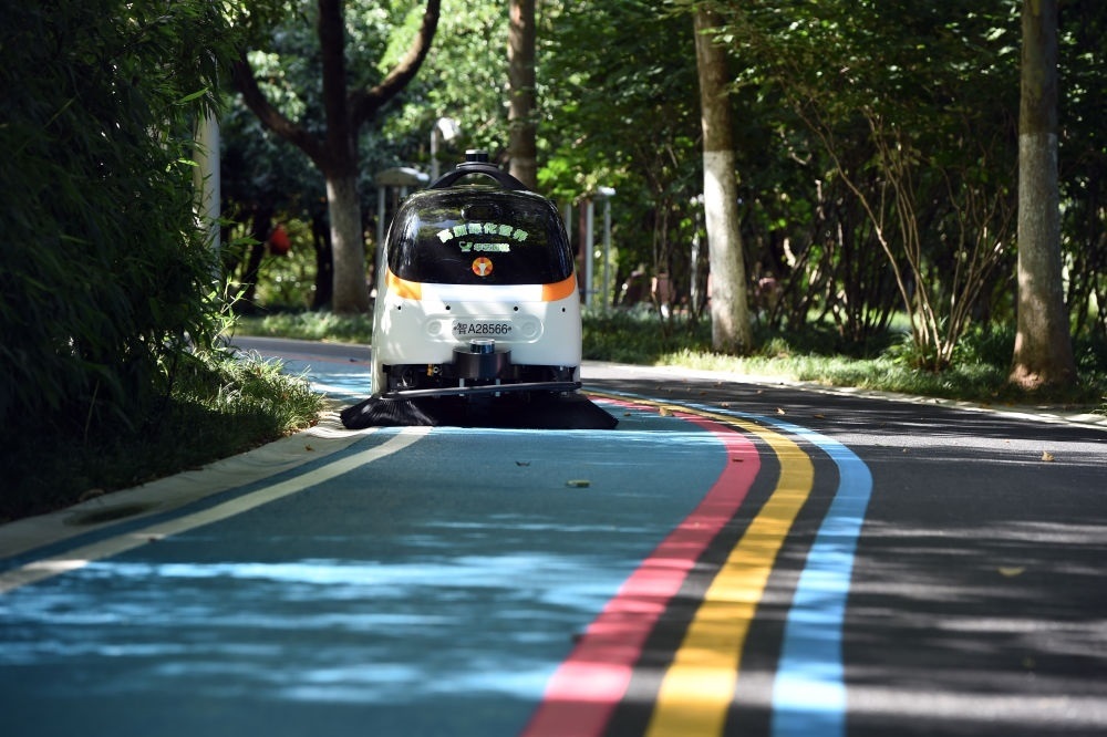 2022年6月24日,智能無(wú)人清掃機(jī)器人在安徽合肥一處公園清掃路面。