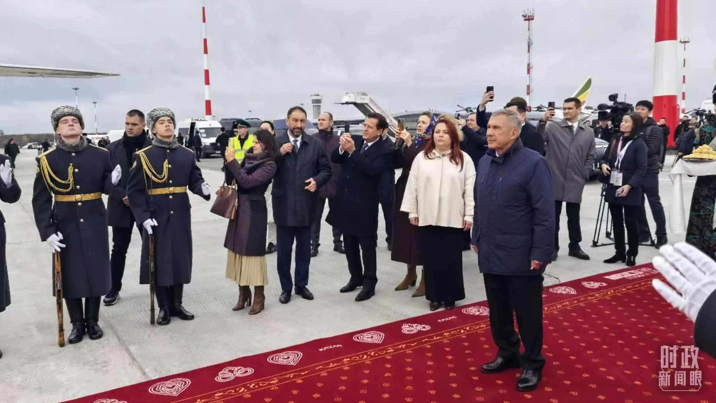 △ 習(xí)主席專(zhuān)機(jī)抵達(dá)喀山國(guó)際機(jī)場(chǎng)時(shí),俄羅斯聯(lián)邦韃靼斯坦共和國(guó)行政長(zhǎng)官等在機(jī)場(chǎng)熱情迎接。(總臺(tái)央視記者王鵬飛拍攝)