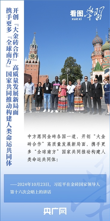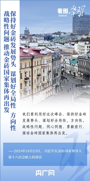 當?shù)貢r間10月23日,國家主席習近平在俄羅斯喀山出席金磚國家領導人第十六次會晤并發(fā)表重要講話。習主席深刻闡述推動“大金磚合作”高質(zhì)量發(fā)展的中國主張,就金磚大家庭發(fā)展合作提出五點務實舉措,表達了中方愿同金磚各國一道,攜手更多“全球南方”國家共同推動構(gòu)建人類命運共同體的真誠愿望。一起來學習!
