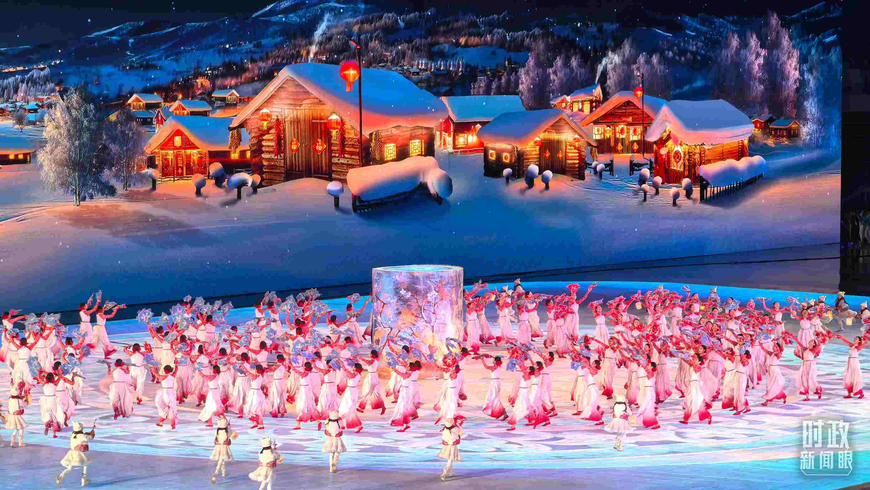 開幕式以“哈爾濱、中國、亞洲”的地域遞進(jìn)層次展開。一盞冰燈映照新春,講述從啟夢、追夢到圓夢的冰雪夢想。從“冰晶藍(lán)”到“中國紅”,旋轉(zhuǎn)的“冰凌花”盡顯喜迎八方賓朋的熱情。