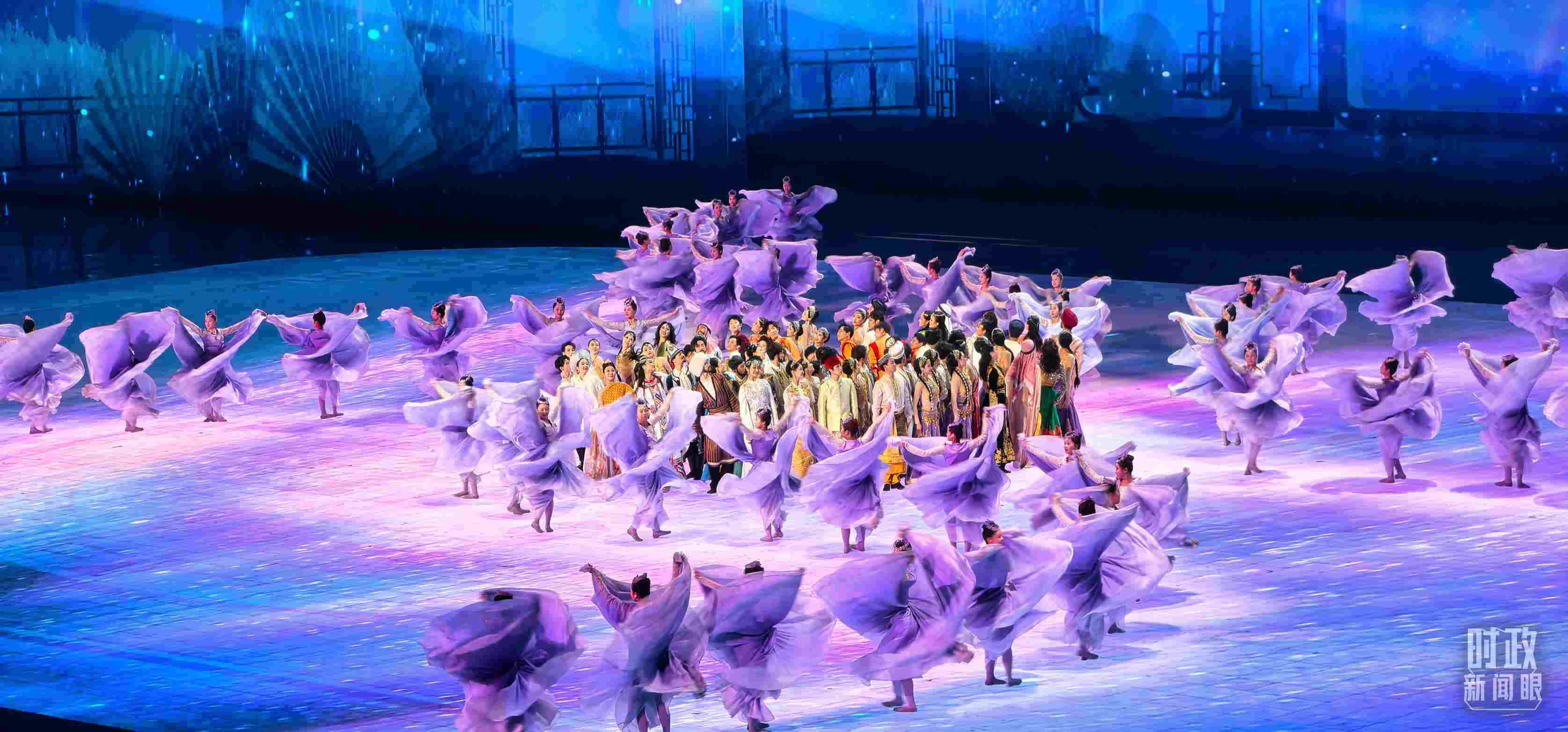 文藝表演分為上篇《熾熱冰雪》、中篇《燃情時(shí)速》、下篇《山高水長》,通過《長歌頌冰河》《榮光耀未來》《馳騁天地間》《璀璨嘉年華》《攜手情久長》《萬里共和鳴》等節(jié)目,展現(xiàn)化“極寒”為“極美”“極燃”“極暖”的意蘊(yùn)。