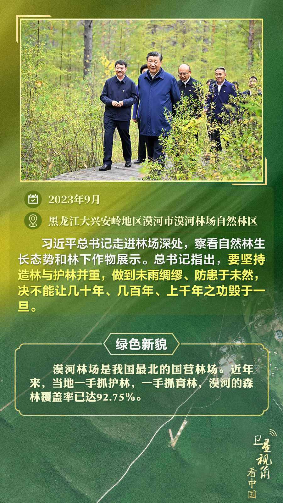通過(guò)衛(wèi)星視角,一起俯瞰總書(shū)記去過(guò)的這些林區(qū),重溫總書(shū)記對(duì)造林護(hù)林的殷殷囑托,感受綠色新貌。