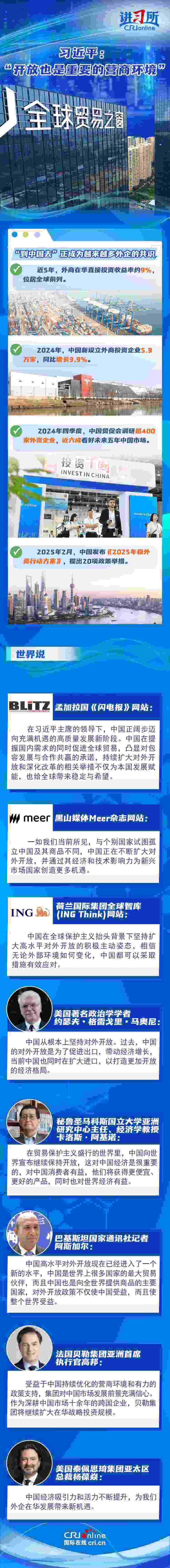 “中國開放的大門不會關(guān)閉,只會越開越大?!比ツ?2月,中國將“擴(kuò)大高水平對外開放,穩(wěn)外貿(mào)、穩(wěn)外資”列為今年政府重點任務(wù)。新年以來,隨著政策紅利持續(xù)釋放,外資不斷用行動為中國投下“信心票”:德國光電行業(yè)巨頭蔡司宣布將在上海購地自建大中華區(qū)總部園區(qū),意大利百旺集團(tuán)亞洲總部暨新工廠在蘇州高新區(qū)開業(yè),日本豐田汽車決定在華獨資設(shè)立雷克薩斯純電動汽車及電池的研發(fā)和生產(chǎn)公司……在他們看來,中國持續(xù)優(yōu)化營商環(huán)境、擴(kuò)大高水平開放,經(jīng)濟(jì)吸引力和活力不斷提升,不僅為中國發(fā)展賦能,也給全球帶來穩(wěn)定與希望。