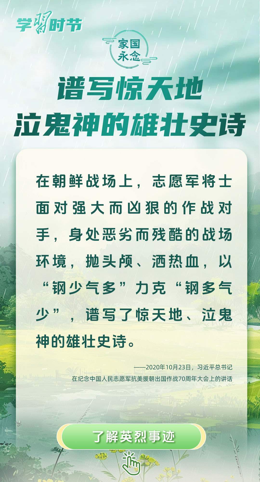 今年是中國人民抗日戰(zhàn)爭暨世界反法西斯戰(zhàn)爭勝利80周年、中國人民志愿軍抗美援朝出國作戰(zhàn)75周年。習(xí)近平總書記曾說:“對一切為國家、為民族、為和平付出寶貴生命的人們,不管時代怎樣變化,我們都要永遠(yuǎn)銘記他們的犧牲和奉獻(xiàn)?!苯裉煳覀兯鶕碛械囊磺?,無不凝結(jié)著英雄、英烈們的奉獻(xiàn)付出乃至巨大犧牲。