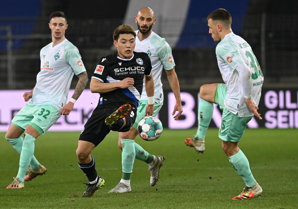 2021年3月10日,當(dāng)時效力于比勒菲爾德隊(duì)的日本球員堂安律(前左)在德甲比賽中帶球突破。他現(xiàn)在效力于德甲弗賴堡俱樂部。新華社發(fā)(烏爾里希·胡夫納格爾 攝)
