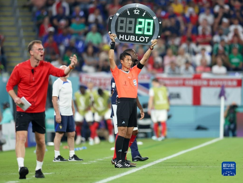 2022年11月26日,第四官員馬寧(右)在卡塔爾世界杯法國隊(duì)對(duì)丹麥隊(duì)的比賽中舉起換人牌。新華社記者 李明 攝