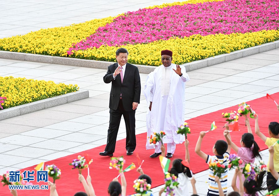 5月28日,國家主席習(xí)近平在北京人民大會堂同尼日爾總統(tǒng)伊素福舉行會談。這是會談前,習(xí)近平在人民大會堂東門外廣場為伊素福舉行歡迎儀式。
