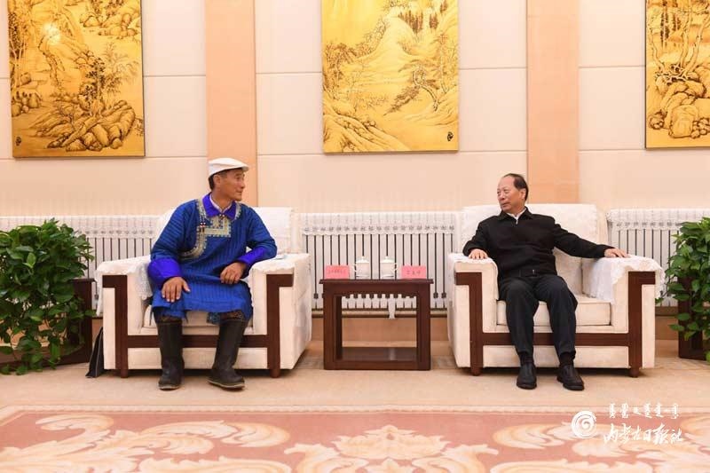 7月29日,自治區(qū)黨委書記、人大常委會(huì)主任石泰峰在主持召開(kāi)草原生態(tài)保護(hù)補(bǔ)助獎(jiǎng)勵(lì)政策實(shí)施情況專題匯報(bào)會(huì)前,會(huì)見(jiàn)自治區(qū)人大代表浩畢斯嘎拉圖。內(nèi)蒙古日?qǐng)?bào)記者袁永紅攝