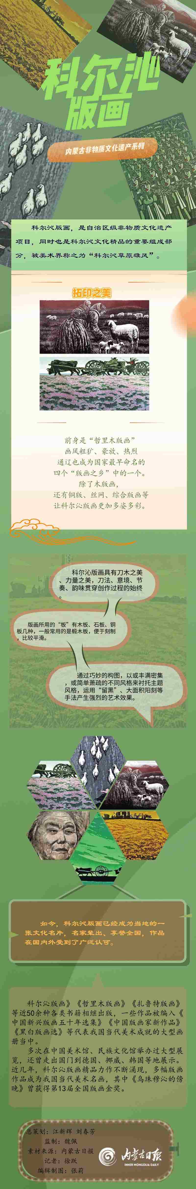 中國(guó)木刻版畫(huà)已有上千年史,自二十世紀(jì)三十年代起,創(chuàng)作版畫(huà)經(jīng)魯迅先生提倡后取得了巨大發(fā)展。內(nèi)蒙古科爾沁版畫(huà)繼承發(fā)揚(yáng)中國(guó)版畫(huà)的精髓,兼收并蓄,創(chuàng)新發(fā)展,以雄渾、純樸、大氣、高雅而著稱,具有鮮明的草原特色。