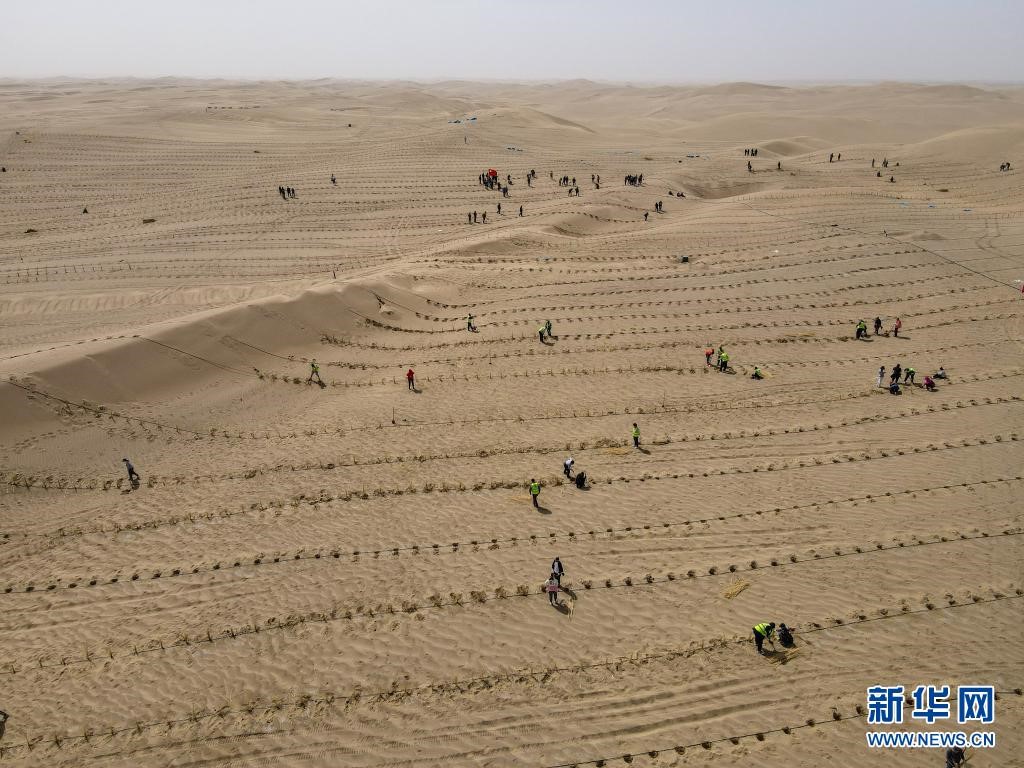 人們在距離新疆且末縣城不遠處的塔克拉瑪干沙漠內(nèi)植樹(3月28日攝,無人機照片)。新華社記者 高晗 攝