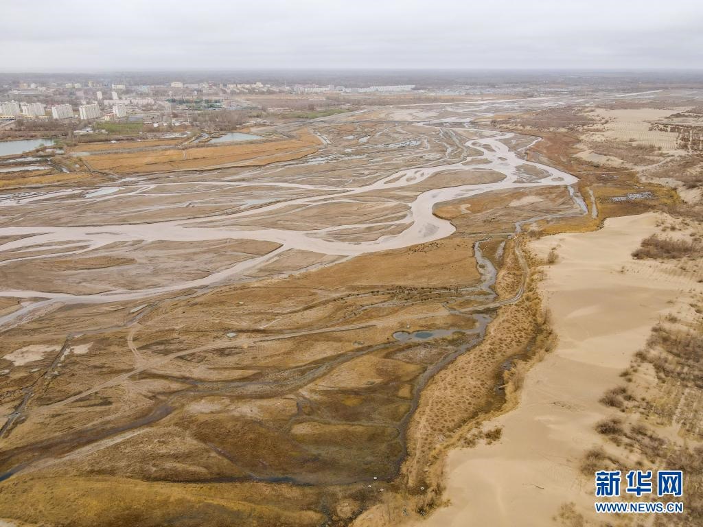 新疆且末縣城與塔克拉瑪干沙漠之間隔著車爾臣河(3月31日攝,無人機照片)。新華社記者 高晗 攝
