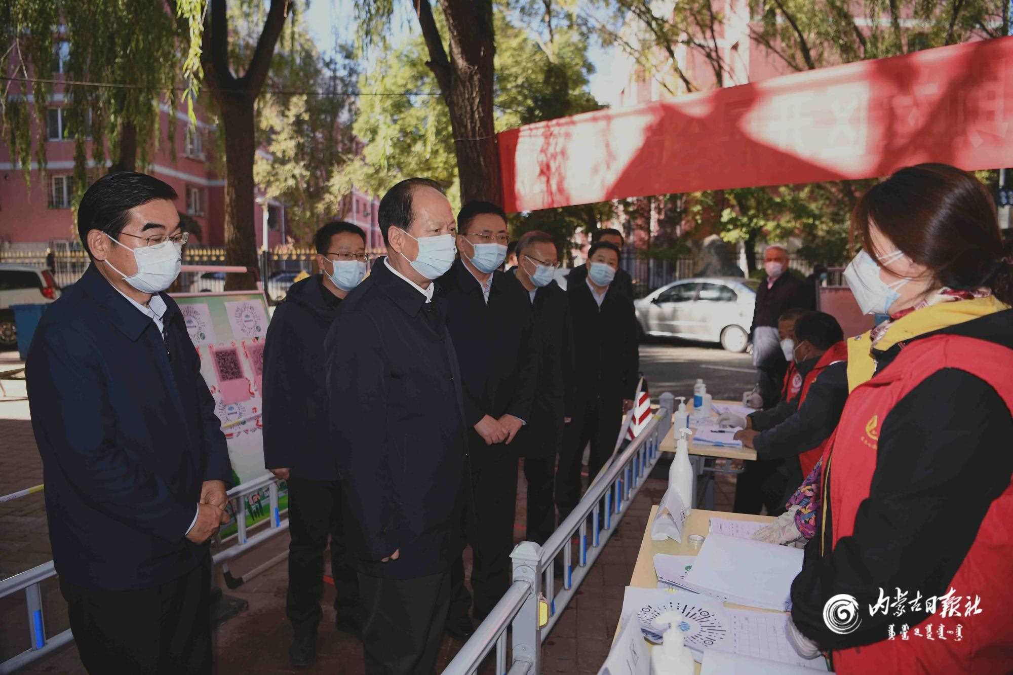 10月26日,自治區(qū)黨委書(shū)記、人大常委會(huì)主任石泰峰在學(xué)府花園小區(qū),檢查入口健康碼查驗(yàn)、體溫檢測(cè)、值班值守等情況,并來(lái)到核酸檢測(cè)采樣點(diǎn),仔細(xì)察看采樣登記流程。內(nèi)蒙古日?qǐng)?bào)社融媒體記者 袁永紅 攝