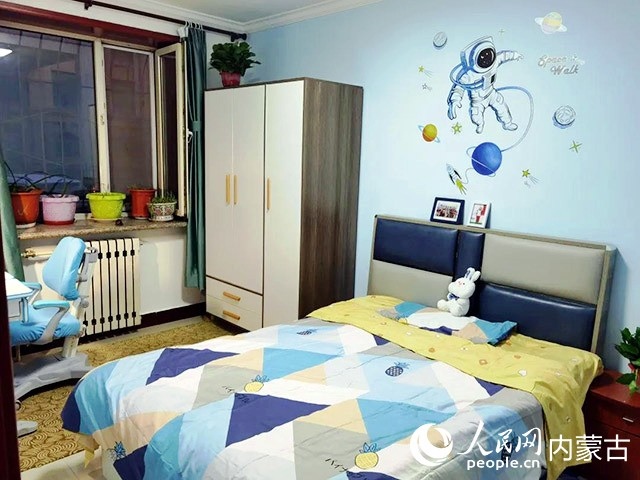 在對原有住房進(jìn)行規(guī)劃、設(shè)計(jì)后,施工隊(duì)開始裝修,并配備必要的家具、臥具和學(xué)習(xí)生活用品。歷時(shí)半個(gè)多月,一間以藍(lán)色為主色調(diào)的小屋建成了?,F(xiàn)在,屬于浩博的那一半臥室,泛黃的臥室墻壁被粉刷成淡藍(lán)色,換了新的小床和衣柜,新添置的書桌上擺滿了課外書,看起來整潔又溫馨。